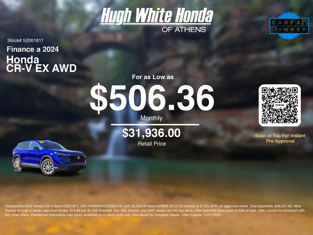 Our car loan payment calculator can help you calculate car payment options for this and other Honda finance offers that leverage the benefits of Honda Financial Services.@@ Call or drive in for Honda finance deals like this stunning 2024 Honda CR-V with finance options near Athens! Use our car monthly payment calculator to estimate your car payment, or try our car payment estimator to explore different loan terms. These Honda finance specials end 10/31/2025.