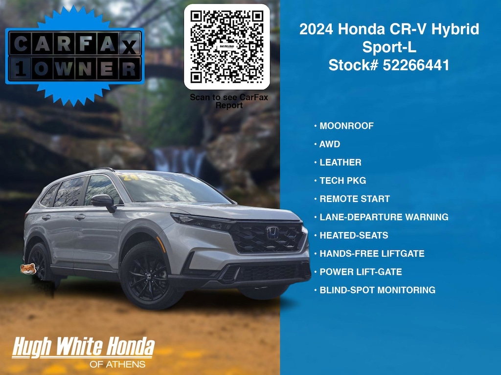Our Car Dealership in Athens, OH: Call Hugh White Honda Athens today at (844) 859-8630 TO SCHEDULE YOUR TEST DRIVE of this 2024 Honda CR-V Hybrid Sport-L! Hugh White Honda Athens serves Athens, OH. You can also visit us at, 250 Athens Road. Athens, OH 45701 to check it out in person!