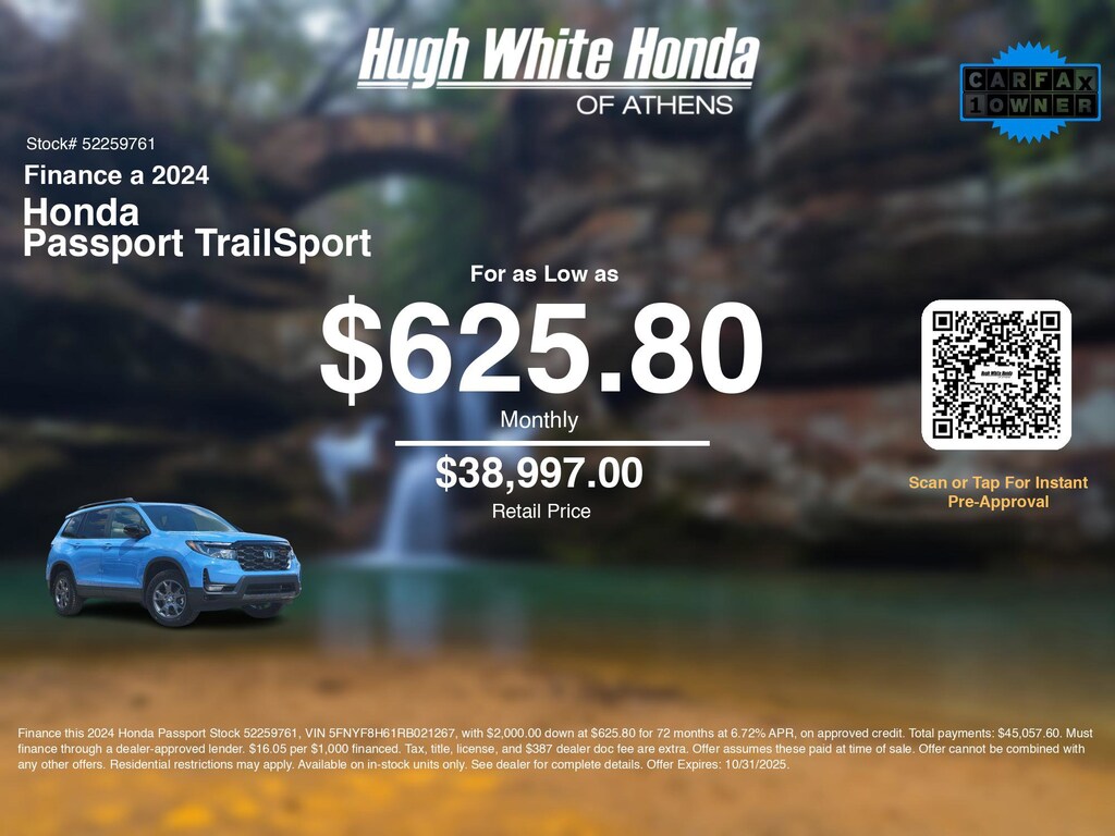 If you're ready to finance a Honda Certified used car near Athens, Nelsonville, Logan, and Parkersburg, Hugh White Honda of Athens is thrilled to offer you a competitive finance offer on this 2024 Honda Passport TrailSport. Use our car payment calculator to estimate your car payment, or see how the monthly payment of $625.80 is calculated for well-qualified buyers shopping at Hugh White Honda of Athens with Tier 1 credit: