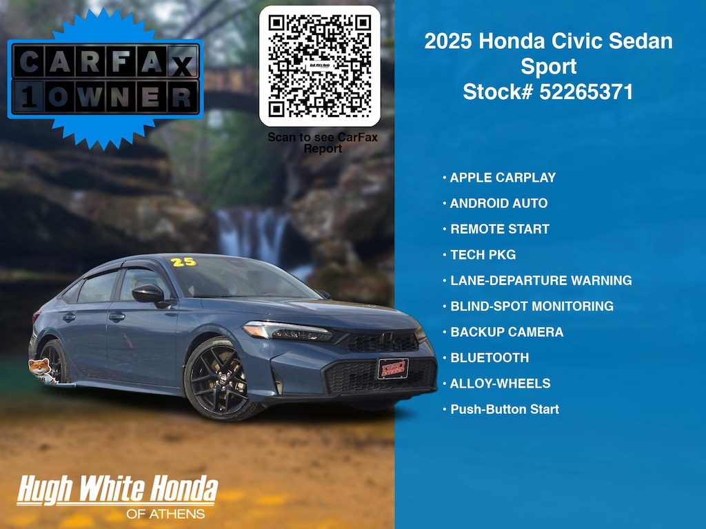 Honda Certified CARFAX 1-Owner, Free CARFAX report! DESIRABLE FEATURES: This popular Honda Certified 2025 Civic Sedan Sport features: APPLE CARPLAY, TECH PKG, LANE-DEPARTURE WARNING, ANDROID AUTO, REMOTE START, BLUETOOTH, BACKUP CAMERA, BLIND-SPOT MONITORING, ALLOY-WHEELS, Push-Button Start, Remote entry, and is available today at our Athens, OH Honda dealership near you.This fwd Certified Pre Owned 2025 Civic Sedan Sport features a Blue Lagoon Pearl exterior with a Black Synthetic Leather interior and has only 28,662 miles.