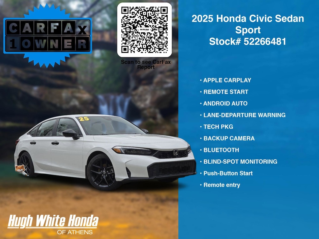 Our Car Dealership in Athens, OH: Call Hugh White Honda Athens today at (844) 859-8630 TO SCHEDULE YOUR TEST DRIVE of this 2025 Honda Civic Sedan Sport! Hugh White Honda Athens serves Athens, OH. You can also visit us at, 250 Athens Road. Athens, OH 45701 to check it out in person!