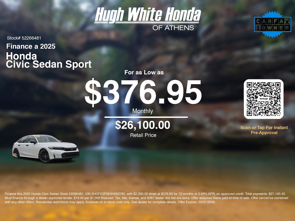 Disclaimer: Finance this 2025 Honda Civic Sedan Stock 52266481, VIN 2HGFE2F56SH562785, with $2,000.00 down at $376.95 for 72 months at 3.99% APR, on approved credit. Total payments: $27,140.40. Must finance through a dealer-approved lender. $14.44 per $1,000 financed. Tax, title, license, and $387 dealer doc fee are extra. Offer assumes these paid at time of sale. Offer cannot be combined with any other offers. Residential restrictions may apply. Available on in-stock units only. See dealer for complete details. Offer Expires: 03/31/2026.