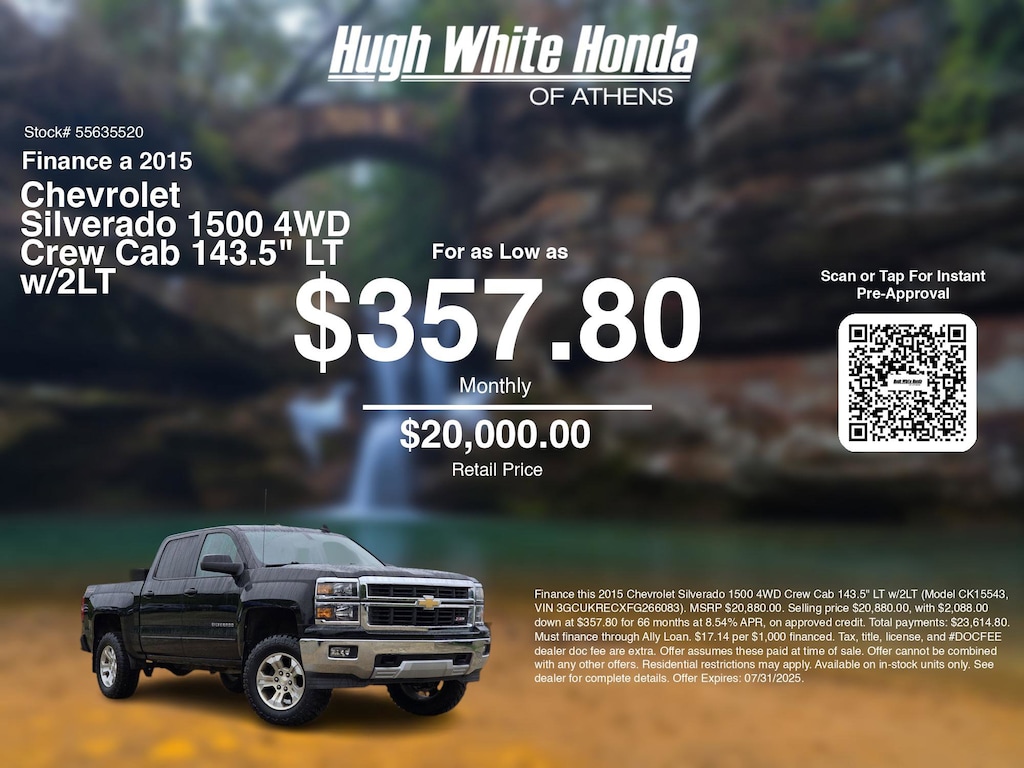 Our Car Dealership in Athens, OH: Call Hugh White Athens today at (844) 859-8630 TO SCHEDULE YOUR TEST DRIVE of this 2015 Chevrolet Silverado 1500 LT. You can also visit us at 250 Columbus Road. Athens, OH 45701 to check it out in person! Our Hugh White Athens Used car dealership only sells used cars Athens, OH buyers can trust for safety and worry free driving.
