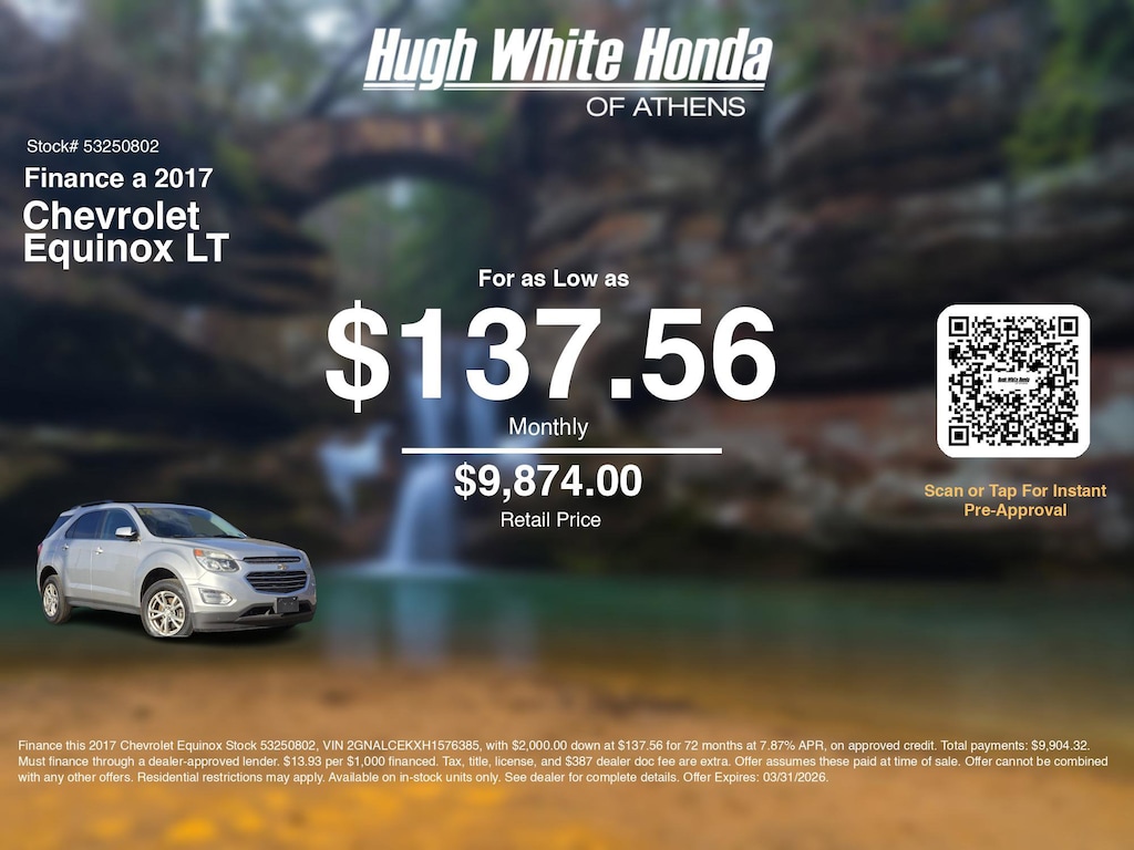 Our car loan payment calculator can help you calculate car payment options for this and other Honda finance offers that leverage the benefits of Honda Financial Services.@@ Call or drive in for Honda finance deals like this stunning 2017 Chevrolet Equinox with finance options near Athens! Use our car monthly payment calculator to estimate your car payment, or try our car payment estimator to explore different loan terms. These Honda finance specials end 3/31/2026.