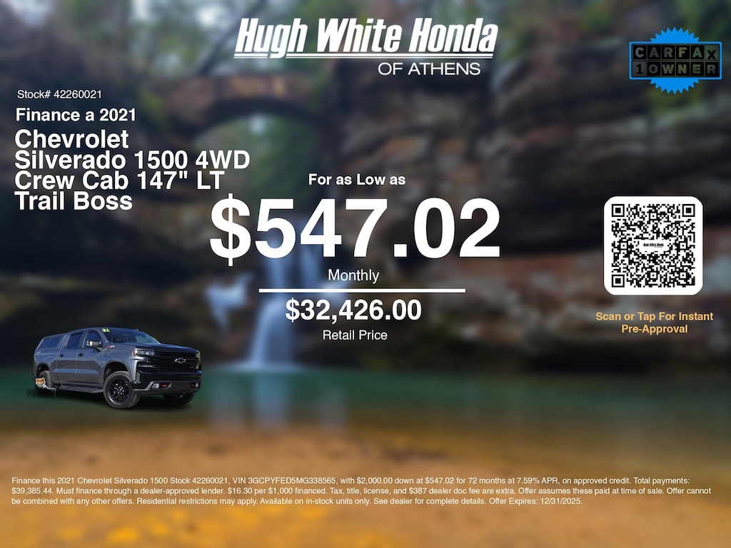 If you're ready to finance a quality used vehicle near Athens, Nelsonville, Logan, and Parkersburg, Hugh White Honda of Athens is thrilled to offer you a competitive finance offer on this 2021 Chevrolet Silverado 1500 4WD Crew Cab 147" LT Trail Boss. Use our car payment calculator to estimate your monthly payments or see how the monthly payment of $547.02 is calculated for well-qualified buyers shopping at Hugh White Honda of Athens with Tier 1 credit: