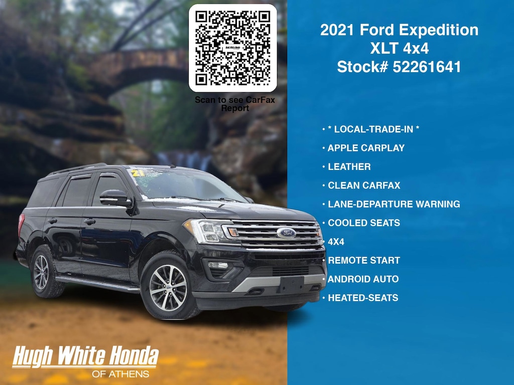 Free CARFAX report! DESIRABLE FEATURES: * LOCAL-TRADE-IN *, CLEAN CARFAX, LEATHER, APPLE CARPLAY, HEATED-SEATS, LANE-DEPARTURE WARNING, COOLED SEATS, ANDROID AUTO, REMOTE START, TECH PKG, 4X4, 3RD ROW SEAT, KEYLESS-START, TURBO, TOW PKG, BLUETOOTH, BACKUP CAMERA, BLIND-SPOT MONITORING, RUNNING BOARDS, WIRELESS PHONE CHARGING, ALLOY-WHEELS, FOG LAMPS, MULTI-ZONE AC, BACKUP-SENSORS, WiFi Hotspot, Remote entry, SiriusXM. Your 2021 Ford Expedition XLT 4x4 is perfect for daily work or weekend road trips to our neighboring communities of Athens.Hugh White Athens also offers extended vehicle service contracts so our Athens, OH area drivers enjoy a worry free used car, SUV or van ownership experience.