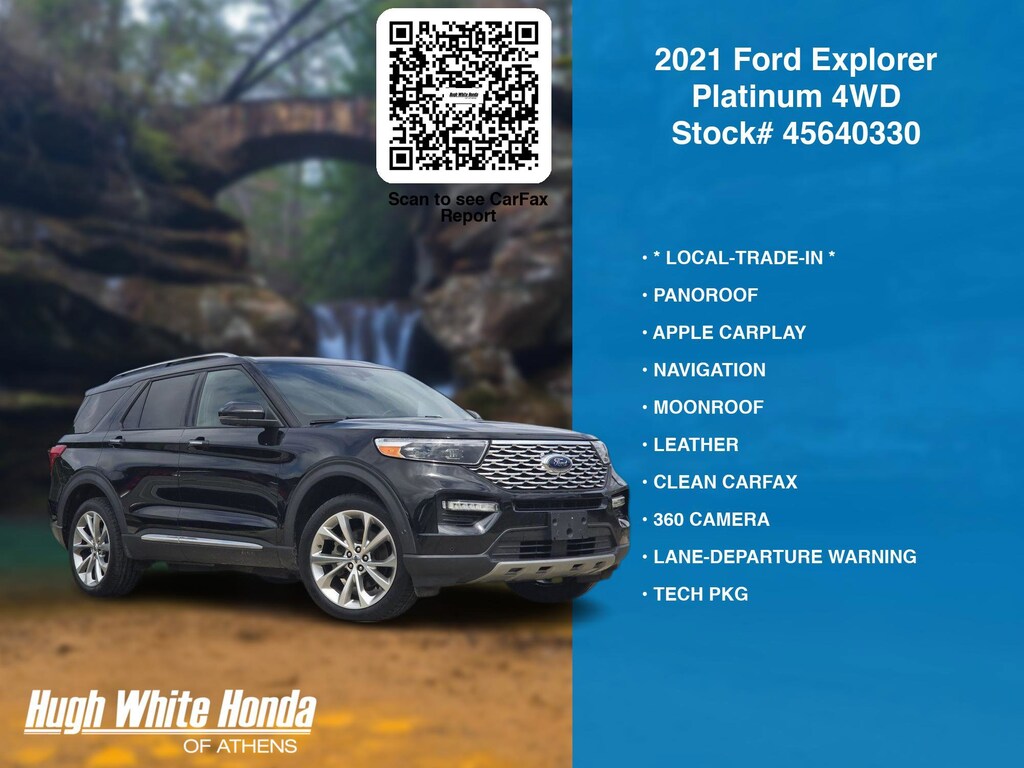 Free CARFAX report! DESIRABLE FEATURES: * LOCAL-TRADE-IN *, MOONROOF, CLEAN CARFAX, APPLE CARPLAY, NAVIGATION, PANOROOF, LEATHER, 360 CAMERA, ANDROID AUTO, LANE-DEPARTURE WARNING, COOLED SEATS, 4X4, REMOTE START, HEATED-REAR SEATS, TECH PKG, HEATED-SEATS, PREMIUM AUDIO, KEYLESS-START, 3RD ROW SEAT, HEATED-STEERING WHEEL, HANDS-FREE LIFTGATE, BLIND-SPOT MONITORING, BLUETOOTH, POWER LIFT-GATE, BACKUP CAMERA, FOG LAMPS, MULTI-ZONE AC, BACKUP-SENSORS, WiFi Hotspot, 2nd ROW CAPTAINS, Remote entry, SiriusXM. Your 2021 Ford Explorer Platinum 4WD is perfect for daily work or weekend road trips to our neighboring communities of Athens.Hugh White Athens also offers extended vehicle service contracts so our Athens, OH area drivers enjoy a worry free used car, SUV or van ownership experience.