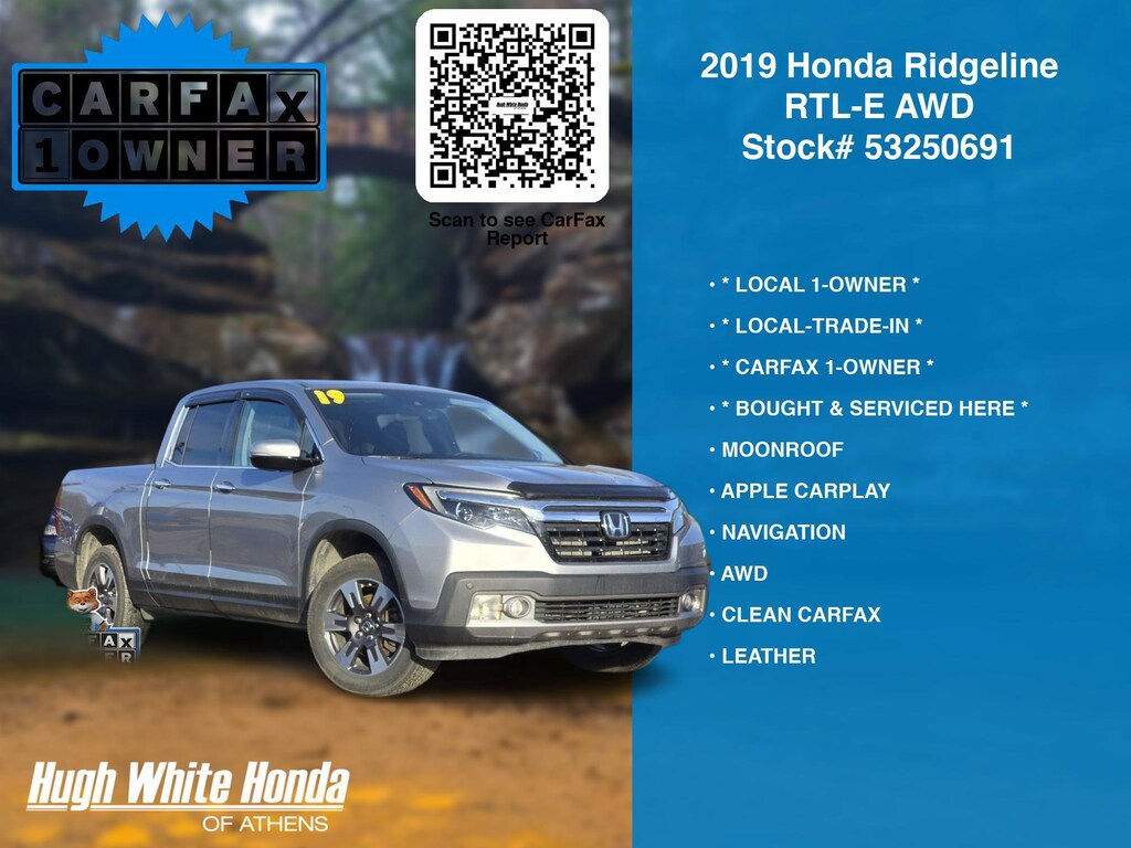 CARFAX VERIFIED 1-OWNER. Free CARFAX report! DESIRABLE FEATURES: * LOCAL 1-OWNER *, * CARFAX 1-OWNER *, * LOCAL-TRADE-IN *, * BOUGHT & SERVICED HERE *, APPLE CARPLAY, LEATHER, MOONROOF, NAVIGATION, CLEAN CARFAX, AWD, ANDROID AUTO, LANE-DEPARTURE WARNING, REMOTE START, HEATED-SEATS, TECH PKG, HEATED-STEERING WHEEL, PREMIUM AUDIO, TOW PKG, KEYLESS-START, BACKUP CAMERA, BLUETOOTH, BED LINER, BLIND-SPOT MONITORING, HOMELINK, BACKUP-SENSORS, ALLOY-WHEELS, FOG LAMPS, MULTI-ZONE AC, SiriusXM, Remote entry. Your 2019 Honda Ridgeline RTL-E AWD is perfect for daily work or weekend road trips to our neighboring communities of Athens.Hugh White Athens also offers extended vehicle service contracts so our Athens, OH area drivers enjoy a worry free used car, SUV or van ownership experience.