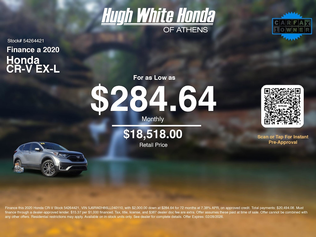 If you're ready to finance a quality used vehicle near Athens, Nelsonville, Logan, and Parkersburg, Hugh White Honda of Athens is thrilled to offer you a competitive finance offer on this 2020 Honda CR-V EX-L. Use our car payment calculator to estimate your monthly payments or see how the monthly payment of $284.64 is calculated for well-qualified buyers shopping at Hugh White Honda of Athens with Tier 1 credit: