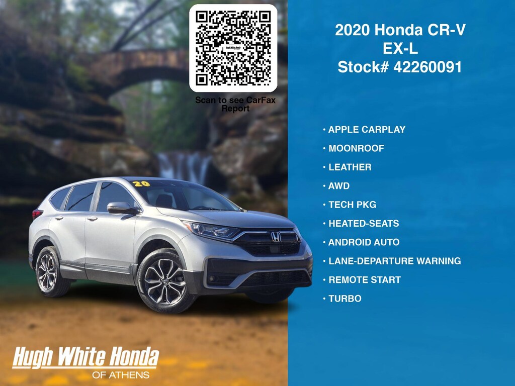 Our Car Dealership in Athens, OH: Call Hugh White Athens today at (844) 859-8630 TO SCHEDULE YOUR TEST DRIVE of this 2020 Honda CR-V EX-L. You can also visit us at 250 Columbus Road. Athens, OH 45701 to check it out in person! Our Hugh White Athens Used car dealership only sells used cars Athens, OH buyers can trust for safety and worry free driving.