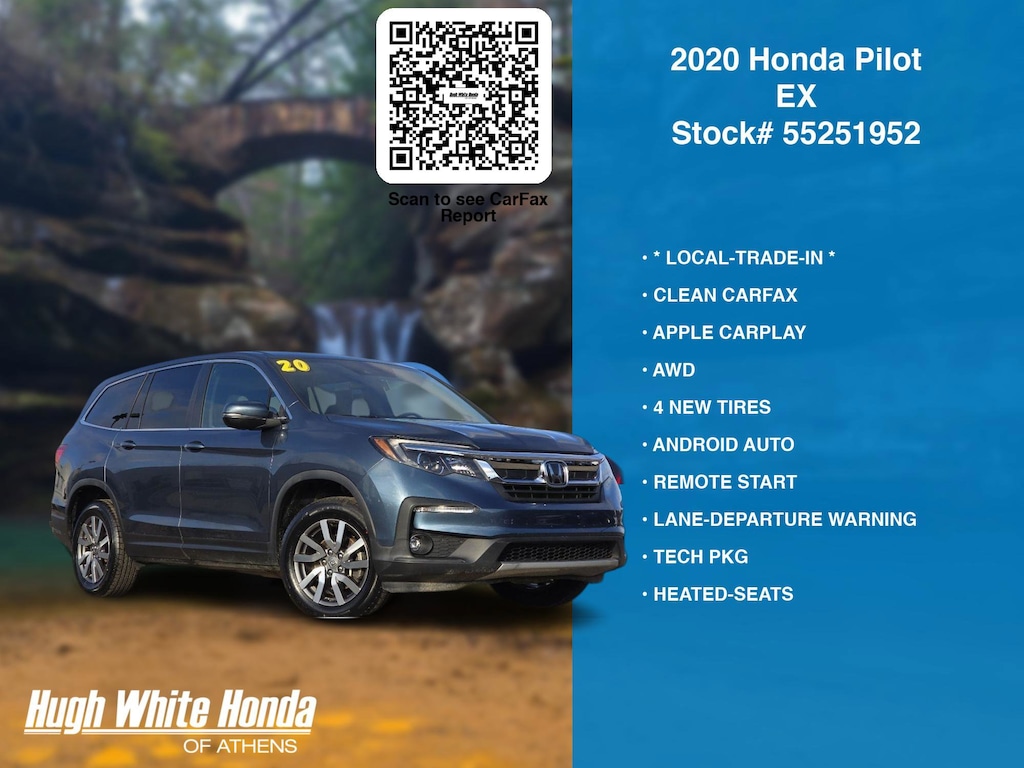 Free CARFAX report! DESIRABLE FEATURES: * LOCAL-TRADE-IN *, CLEAN CARFAX, 4 NEW TIRES, APPLE CARPLAY, AWD, ANDROID AUTO, REMOTE START, LANE-DEPARTURE WARNING, TECH PKG, HEATED-SEATS, KEYLESS-START, 3RD ROW SEAT, BACKUP CAMERA, BLIND-SPOT MONITORING, BLUETOOTH, FOG LAMPS, ALLOY-WHEELS, MULTI-ZONE AC, SiriusXM, Remote entry. Your 2020 Honda Pilot EX is perfect for daily work or weekend road trips to our neighboring communities of Athens.Hugh White Athens also offers extended vehicle service contracts so our Athens, OH area drivers enjoy a worry free used car, SUV or van ownership experience.