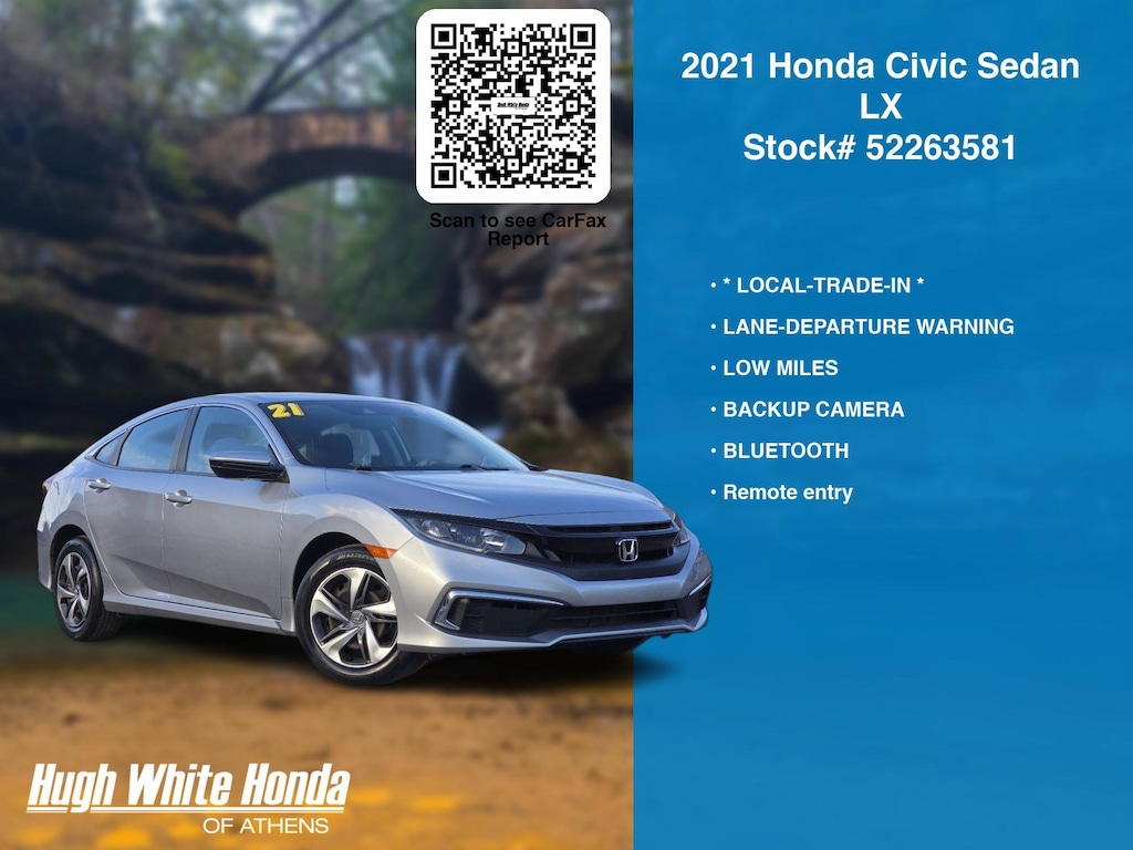 Our Car Dealership in Athens, OH: Call Hugh White Athens today at (844) 859-8630 TO SCHEDULE YOUR TEST DRIVE of this 2021 Honda Civic Sedan LX. You can also visit us at 250 Columbus Road. Athens, OH 45701 to check it out in person! Our Hugh White Athens Used car dealership only sells used cars Athens, OH buyers can trust for safety and worry free driving.