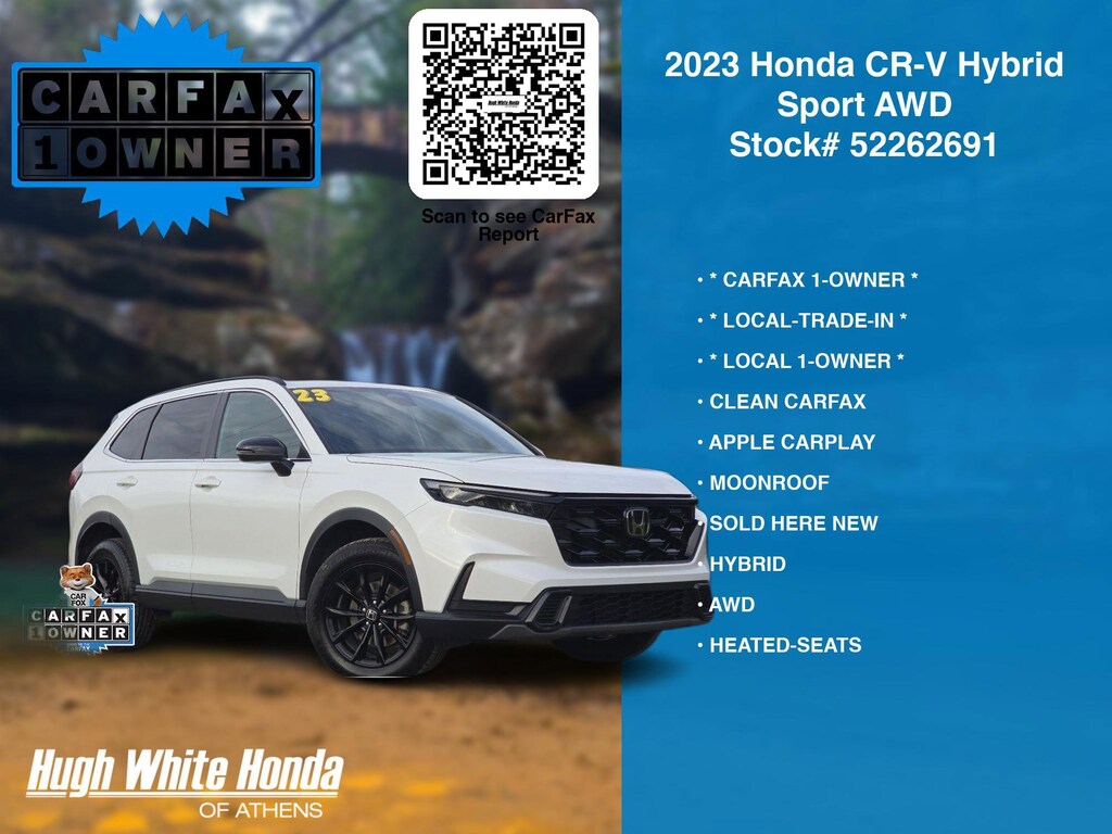 CARFAX VERIFIED 1-OWNER. Free CARFAX report! DESIRABLE FEATURES: * LOCAL 1-OWNER *, * LOCAL-TRADE-IN *, * CARFAX 1-OWNER *, SOLD HERE NEW, APPLE CARPLAY, HYBRID, MOONROOF, CLEAN CARFAX, AWD, LANE-DEPARTURE WARNING, HEATED-SEATS, ANDROID AUTO, REMOTE START, BACKUP CAMERA, BLIND-SPOT MONITORING, BLUETOOTH, MULTI-ZONE AC. Your 2023 Honda CR-V Hybrid Sport AWD is perfect for daily work or weekend road trips to our neighboring communities of Athens.Hugh White Athens also offers extended vehicle service contracts so our Athens, OH area drivers enjoy a worry free used car, SUV or van ownership experience.