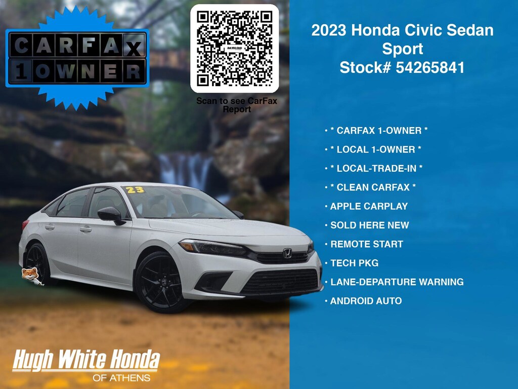 CARFAX VERIFIED 1-OWNER. Free CARFAX report! DESIRABLE FEATURES: * LOCAL 1-OWNER *, * CARFAX 1-OWNER *, * LOCAL-TRADE-IN *, SOLD HERE NEW, CLEAN CARFAX, APPLE CARPLAY, REMOTE START, ANDROID AUTO, LANE-DEPARTURE WARNING, TECH PKG, BLUETOOTH, BACKUP CAMERA, BLIND-SPOT MONITORING, ALLOY-WHEELS, Push-Button Start, Remote entry. Your 2023 Honda Civic Sedan Sport is perfect for daily work or weekend road trips to our neighboring communities of Athens.Hugh White Athens also offers extended vehicle service contracts so our Athens, OH area drivers enjoy a worry free used car, SUV or van ownership experience.
