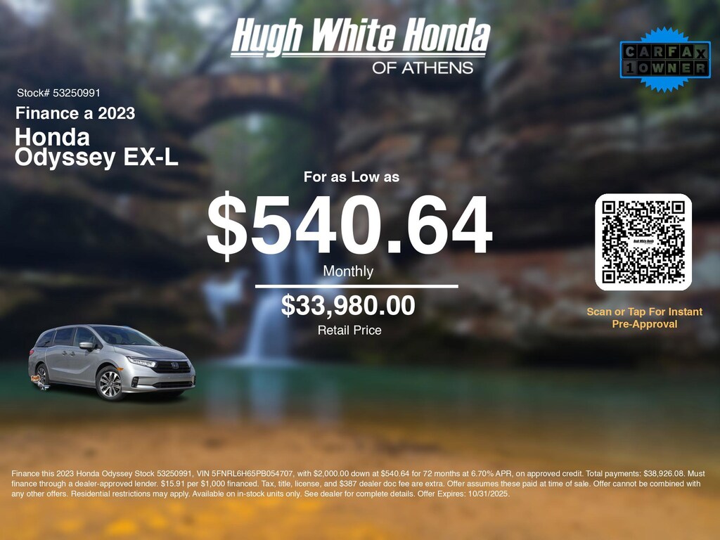 If you're ready to finance a quality used vehicle near Athens, Nelsonville, Logan, and Parkersburg, Hugh White Honda of Athens is thrilled to offer you a competitive finance offer on this 2023 Honda Odyssey EX-L. Use our car payment calculator to estimate your monthly payments or see how the monthly payment of $540.64 is calculated for well-qualified buyers shopping at Hugh White Honda of Athens with Tier 1 credit: