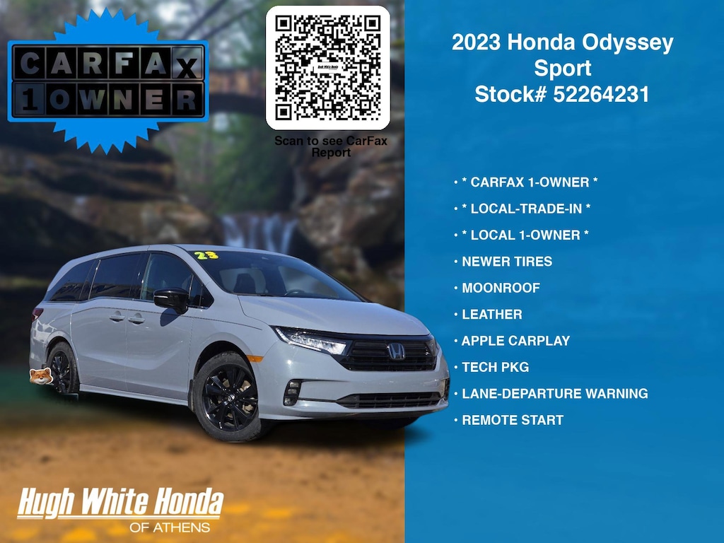 DESIRABLE FEATURES: * LOCAL 1-OWNER *, * LOCAL-TRADE-IN *, * CARFAX 1-OWNER *, NEWER TIRES, APPLE CARPLAY, MOONROOF, LEATHER, HEATED-SEATS, LANE-DEPARTURE WARNING, REMOTE START, ANDROID AUTO, TECH PKG, 3RD ROW SEAT, BLIND-SPOT MONITORING, BLUETOOTH, HANDS-FREE LIFTGATE, BACKUP CAMERA, POWER LIFT-GATE, POWER SLIDING DOORS, ALLOY-WHEELS, FOG LAMPS, HOMELINK, MULTI-ZONE AC, Push-Button Start, Remote entry, SiriusXM. Your 2023 Honda Odyssey Sport is perfect for daily work or weekend road trips to our neighboring communities of Athens.