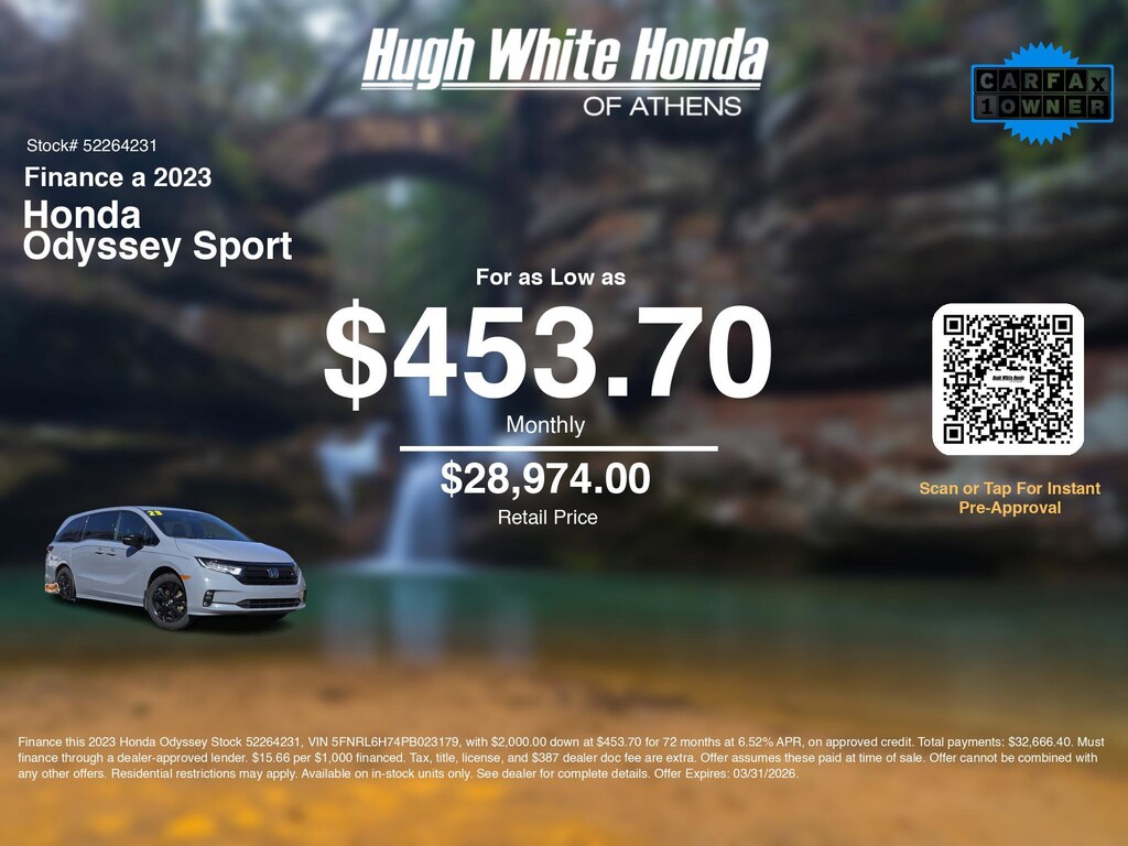 If you're ready to finance a quality used vehicle near Athens, Nelsonville, Logan, and Parkersburg, Hugh White Honda of Athens is thrilled to offer you a competitive finance offer on this 2023 Honda Odyssey Sport. Use our car payment calculator to estimate your monthly payments or see how the monthly payment of $453.70 is calculated for well-qualified buyers shopping at Hugh White Honda of Athens with Tier 1 credit: