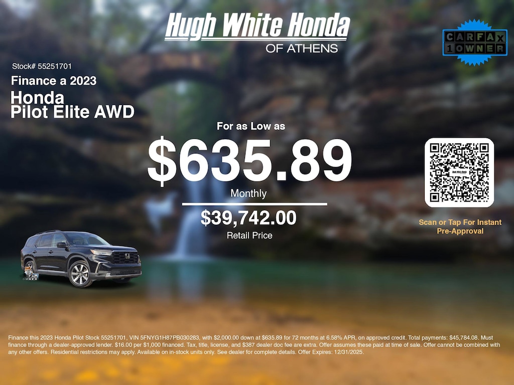 If you're ready to finance a quality used vehicle near Athens, Nelsonville, Logan, and Parkersburg, Hugh White Honda of Athens is thrilled to offer you a competitive finance offer on this 2023 Honda Pilot Elite AWD. Use our car payment calculator to estimate your monthly payments or see how the monthly payment of $635.89 is calculated for well-qualified buyers shopping at Hugh White Honda of Athens with Tier 1 credit: