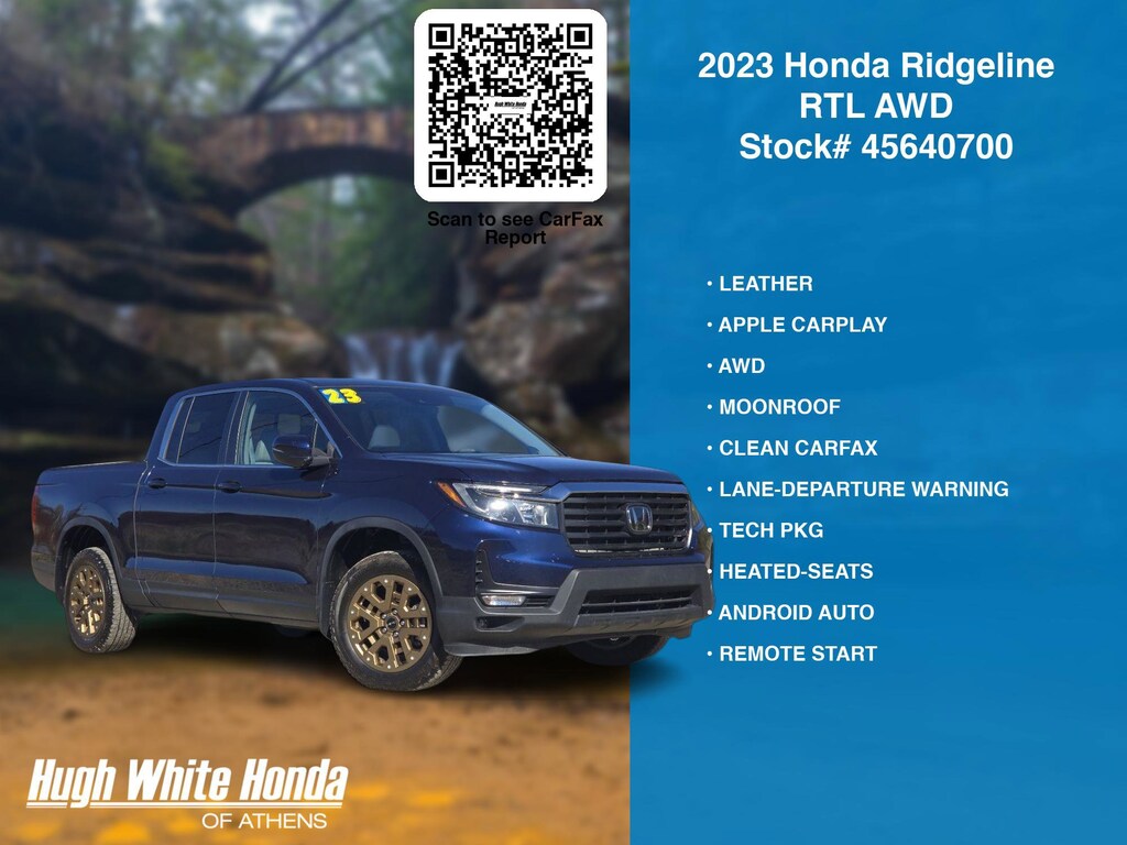 Free CARFAX report! DESIRABLE FEATURES: MOONROOF, LEATHER, CLEAN CARFAX, APPLE CARPLAY, AWD, TECH PKG, HEATED-SEATS, REMOTE START, ANDROID AUTO, LANE-DEPARTURE WARNING, KEYLESS-START, TOW PKG, BLUETOOTH, BED LINER, BACKUP CAMERA, BLIND-SPOT MONITORING, FOG LAMPS, MULTI-ZONE AC, Remote entry, SiriusXM. Your 2023 Honda Ridgeline RTL AWD is perfect for daily work or weekend road trips to our neighboring communities of Athens.Hugh White Athens also offers extended vehicle service contracts so our Athens, OH area drivers enjoy a worry free used car, SUV or van ownership experience.