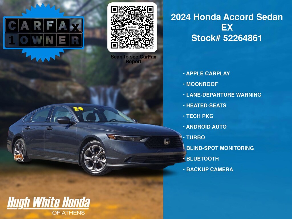 CARFAX VERIFIED 1-OWNER. Free CARFAX report! DESIRABLE FEATURES: APPLE CARPLAY, MOONROOF, LANE-DEPARTURE WARNING, TECH PKG, ANDROID AUTO, HEATED-SEATS, TURBO, BLIND-SPOT MONITORING, BLUETOOTH, BACKUP CAMERA, ALLOY-WHEELS, MULTI-ZONE AC, WiFi Hotspot, Push-Button Start, Remote entry. Your 2024 Honda Accord Sedan EX is perfect for daily work or weekend road trips to our neighboring communities of Athens.Hugh White Athens also offers extended vehicle service contracts so our Athens, OH area drivers enjoy a worry free used car, SUV or van ownership experience.