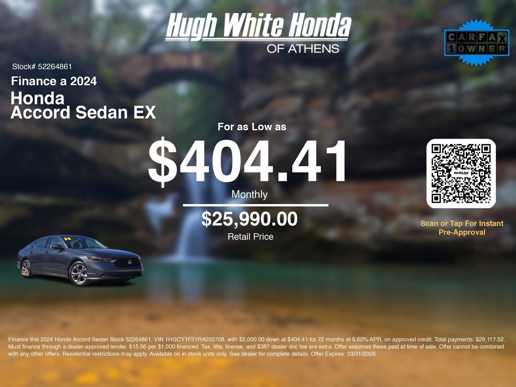 Disclaimer: Finance this 2024 Honda Accord Sedan Stock 52264861, VIN 1HGCY1F31RA055708, with $2,000.00 down at $404.41 for 72 months at 6.60% APR, on approved credit. Total payments: $29,117.52. Must finance through a dealer-approved lender. $15.56 per $1,000 financed. Tax, title, license, and $387 dealer doc fee are extra. Offer assumes these paid at time of sale. Offer cannot be combined with any other offers. Residential restrictions may apply. Available on in-stock units only. See dealer for complete details. Offer Expires: 03/31/2026.