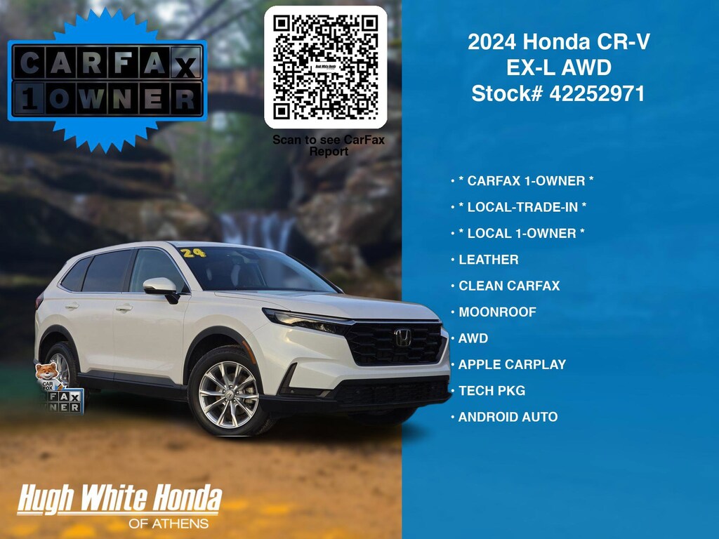 CARFAX VERIFIED 1-OWNER. Free CARFAX report! DESIRABLE FEATURES: * LOCAL 1-OWNER *, * LOCAL-TRADE-IN *, * CARFAX 1-OWNER *, MOONROOF, CLEAN CARFAX, AWD, LEATHER, APPLE CARPLAY, REMOTE START, ANDROID AUTO, LANE-DEPARTURE WARNING, TECH PKG, HEATED-SEATS, TURBO, KEYLESS-START, BLUETOOTH, BACKUP CAMERA, BLIND-SPOT MONITORING, HANDS-FREE LIFTGATE, POWER LIFT-GATE, MULTI-ZONE AC, Remote entry, SiriusXM. Your 2024 Honda CR-V EX-L AWD is perfect for daily work or weekend road trips to our neighboring communities of Athens.Hugh White Athens also offers extended vehicle service contracts so our Athens, OH area drivers enjoy a worry free used car, SUV or van ownership experience.