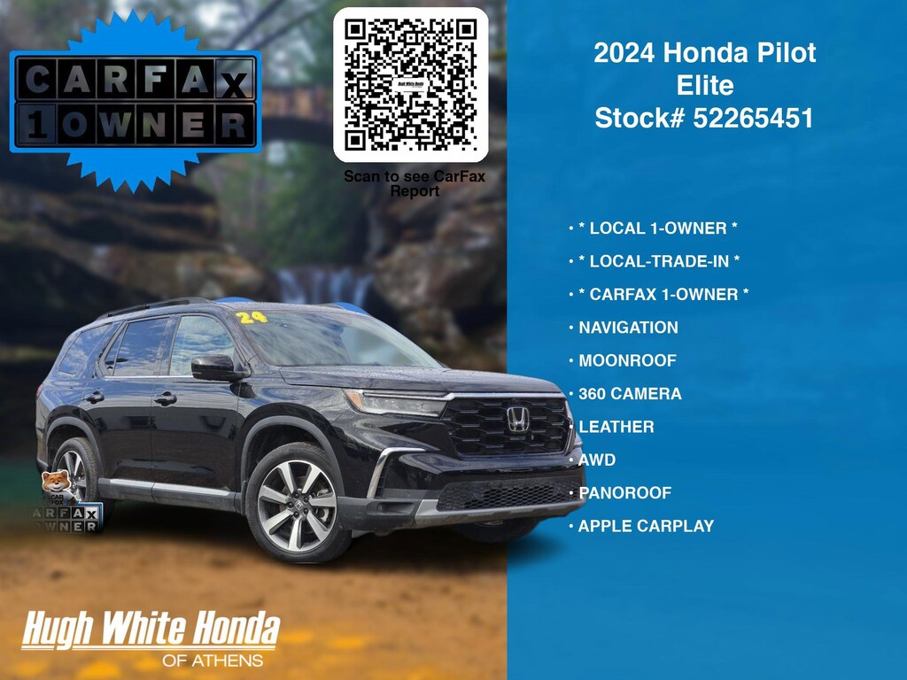 CARFAX VERIFIED 1-OWNER. Free CARFAX report! DESIRABLE FEATURES: * CARFAX 1-OWNER *, * LOCAL 1-OWNER *, * LOCAL-TRADE-IN *, MOONROOF, PANOROOF, NAVIGATION, LEATHER, APPLE CARPLAY, AWD, 360 CAMERA, LANE-DEPARTURE WARNING, COOLED SEATS, TECH PKG, HEATED-SEATS, REMOTE START, ANDROID AUTO, HEATED-REAR SEATS, HEADS-UP DISPLAY, 3RD ROW SEAT, KEYLESS-START, HEATED-STEERING WHEEL, PREMIUM AUDIO, WIRELESS PHONE CHARGING, BLUETOOTH, HANDS-FREE LIFTGATE, BACKUP CAMERA, POWER LIFT-GATE, BLIND-SPOT MONITORING, BACKUP-SENSORS, MULTI-ZONE AC, FOG LAMPS, HOMELINK, ALLOY-WHEELS, WiFi Hotspot, SiriusXM, Remote entry. Your 2024 Honda Pilot Elite is perfect for daily work or weekend road trips to our neighboring communities of Athens.Hugh White Athens also offers extended vehicle service contracts so our Athens, OH area drivers enjoy a worry free used car, SUV or van ownership experience.