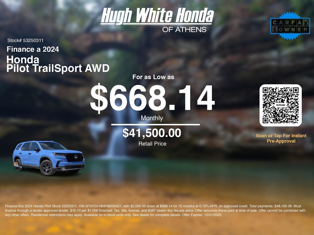 If you're ready to finance a quality used vehicle near Athens, Nelsonville, Logan, and Parkersburg, Hugh White Honda of Athens is thrilled to offer you a competitive finance offer on this 2024 Honda Pilot TrailSport AWD. Use our car payment calculator to estimate your monthly payments or see how the monthly payment of $668.14 is calculated for well-qualified buyers shopping at Hugh White Honda of Athens with Tier 1 credit: