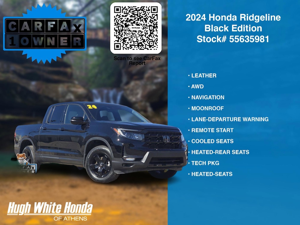 CARFAX VERIFIED 1-OWNER. Free CARFAX report! DESIRABLE FEATURES: MOONROOF, AWD, NAVIGATION, LEATHER, HEATED-SEATS, REMOTE START, TECH PKG, COOLED SEATS, HEATED-REAR SEATS, LANE-DEPARTURE WARNING, PREMIUM AUDIO, HEATED-STEERING WHEEL, BLUETOOTH, BACKUP CAMERA, BLIND-SPOT MONITORING, HOMELINK, MULTI-ZONE AC, FOG LAMPS, ALLOY-WHEELS, Push-Button Start, Remote entry, SiriusXM. Your 2024 Honda Ridgeline Black Edition is perfect for daily work or weekend road trips to our neighboring communities of Athens.Hugh White Athens also offers extended vehicle service contracts so our Athens, OH area drivers enjoy a worry free used car, SUV or van ownership experience.
