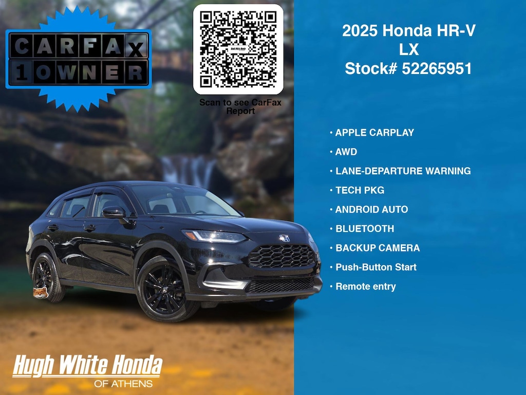 DESIRABLE FEATURES: APPLE CARPLAY, AWD, LANE-DEPARTURE WARNING, TECH PKG, ANDROID AUTO, BLUETOOTH, BACKUP CAMERA, Push-Button Start, Remote entry. Your 2025 Honda HR-V LX is perfect for daily work or weekend road trips to our neighboring communities of Athens.