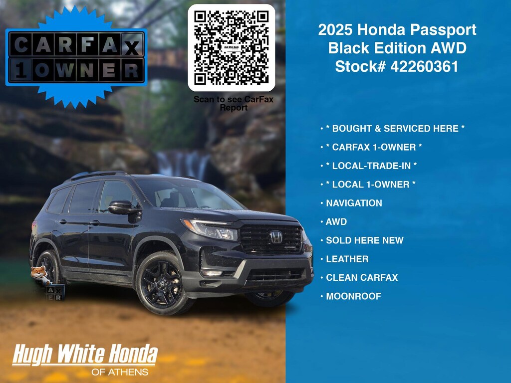 Our Car Dealership in Athens, OH: Call Hugh White Athens today at (844) 859-8630 TO SCHEDULE YOUR TEST DRIVE of this 2025 Honda Passport Black Edition AWD. You can also visit us at 250 Columbus Road. Athens, OH 45701 to check it out in person! Our Hugh White Athens Used car dealership only sells used cars Athens, OH buyers can trust for safety and worry free driving.