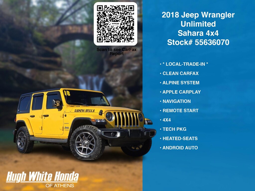 Our Car Dealership in Athens, OH: Call Hugh White Athens today at (844) 859-8630 TO SCHEDULE YOUR TEST DRIVE of this 2018 Jeep Wrangler Unlimited Sahara 4x4. You can also visit us at 250 Columbus Road. Athens, OH 45701 to check it out in person! Our Hugh White Athens Used car dealership only sells used cars Athens, OH buyers can trust for safety and worry free driving.