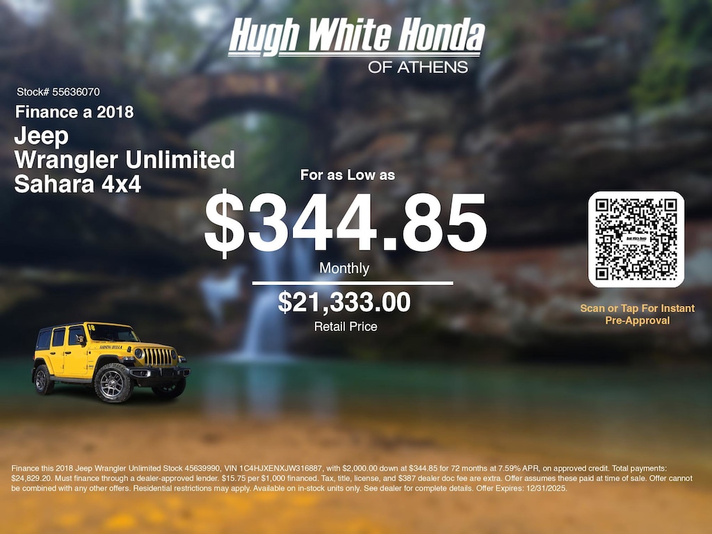 Our car loan payment calculator can help you calculate car payment options for this and other Honda finance offers that leverage the benefits of Honda Financial Services.@@ Call or drive in for Honda finance deals like this stunning 2018 Jeep Wrangler Unlimited with finance options near Athens! Use our car monthly payment calculator to estimate your car payment, or try our car payment estimator to explore different loan terms. These Honda finance specials end 12/31/2025.