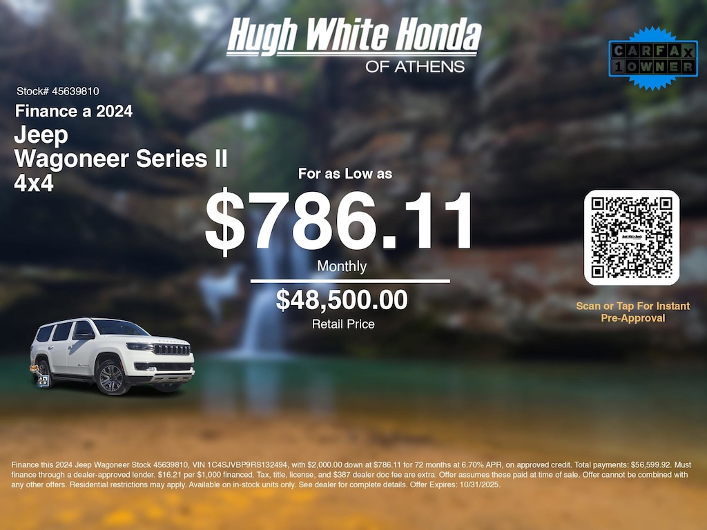 If you're ready to finance a quality used vehicle near Athens, Nelsonville, Logan, and Parkersburg, Hugh White Honda of Athens is thrilled to offer you a competitive finance offer on this 2024 Jeep Wagoneer Series II 4x4. Use our car payment calculator to estimate your monthly payments or see how the monthly payment of $786.11 is calculated for well-qualified buyers shopping at Hugh White Honda of Athens with Tier 1 credit: