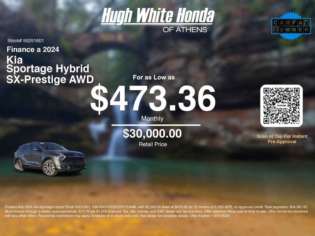 If you're ready to finance a quality used vehicle near Athens, Nelsonville, Logan, and Parkersburg, Hugh White Honda of Athens is thrilled to offer you a competitive finance offer on this 2024 Kia Sportage Hybrid SX-Prestige AWD. Use our car payment calculator to estimate your monthly payments or see how the monthly payment of $473.36 is calculated for well-qualified buyers shopping at Hugh White Honda of Athens with Tier 1 credit: