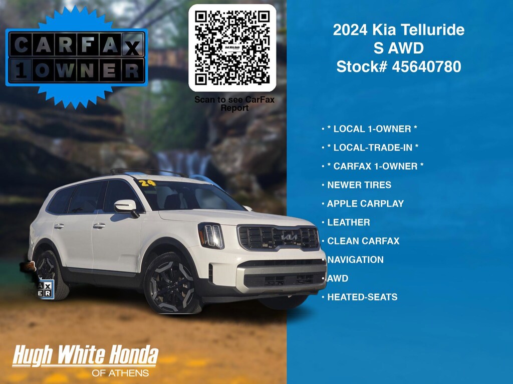 CARFAX VERIFIED 1-OWNER. Free CARFAX report! DESIRABLE FEATURES: * CARFAX 1-OWNER *, * LOCAL 1-OWNER *, * LOCAL-TRADE-IN *, LEATHER, APPLE CARPLAY, CLEAN CARFAX, AWD, NEWER TIRES, NAVIGATION, TECH PKG, ANDROID AUTO, LANE-DEPARTURE WARNING, HEATED-SEATS, REMOTE START, KEYLESS-START, 3RD ROW SEAT, BLIND-SPOT MONITORING, BLUETOOTH, BACKUP CAMERA, MULTI-ZONE AC, BACKUP-SENSORS, WiFi Hotspot, 2nd ROW CAPTAINS, SiriusXM, Remote entry. Your 2024 Kia Telluride S AWD is perfect for daily work or weekend road trips to our neighboring communities of Athens.Hugh White Athens also offers extended vehicle service contracts so our Athens, OH area drivers enjoy a worry free used car, SUV or van ownership experience.