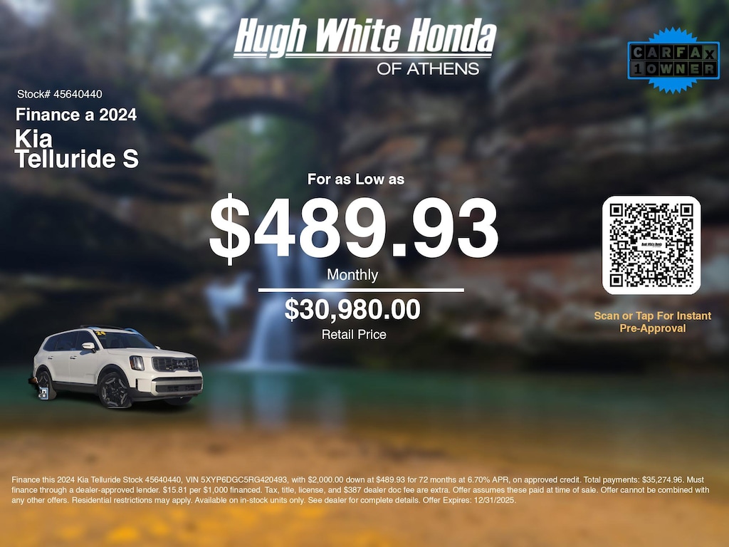 If you're ready to finance a quality used vehicle near Athens, Nelsonville, Logan, and Parkersburg, Hugh White Honda of Athens is thrilled to offer you a competitive finance offer on this 2024 Kia Telluride S. Use our car payment calculator to estimate your monthly payments or see how the monthly payment of $489.93 is calculated for well-qualified buyers shopping at Hugh White Honda of Athens with Tier 1 credit: