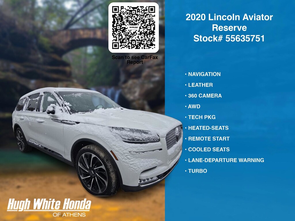 Free CARFAX report! DESIRABLE FEATURES: LEATHER, NAVIGATION, 360 CAMERA, AWD, LANE-DEPARTURE WARNING, HEATED-SEATS, REMOTE START, TECH PKG, COOLED SEATS, 3RD ROW SEAT, PREMIUM AUDIO, KEYLESS-START, TURBO, BLIND-SPOT MONITORING, POWER LIFT-GATE, BLUETOOTH, HANDS-FREE LIFTGATE, BACKUP CAMERA, FOG LAMPS, MULTI-ZONE AC, WiFi Hotspot, Remote entry, SiriusXM. Your 2020 Lincoln Aviator Reserve is perfect for daily work or weekend road trips to our neighboring communities of Athens.Hugh White Athens also offers extended vehicle service contracts so our Athens, OH area drivers enjoy a worry free used car, SUV or van ownership experience.