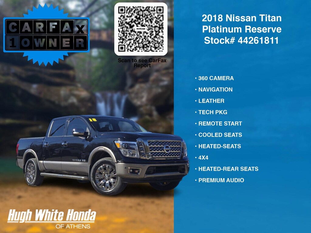 Our Car Dealership in Athens, OH: Call Hugh White Athens today at (844) 859-8630 TO SCHEDULE YOUR TEST DRIVE of this 2018 Nissan Titan Platinum Reserve. You can also visit us at 250 Columbus Road. Athens, OH 45701 to check it out in person! Our Hugh White Athens Used car dealership only sells used cars Athens, OH buyers can trust for safety and worry free driving.
