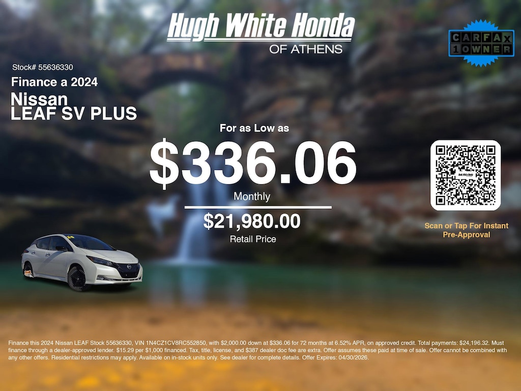If you're ready to finance a quality used vehicle near Athens, Nelsonville, Logan, and Parkersburg, Hugh White Honda of Athens is thrilled to offer you a competitive finance offer on this 2024 Nissan LEAF SV PLUS. Use our car payment calculator to estimate your monthly payments or see how the monthly payment of $336.06 is calculated for well-qualified buyers shopping at Hugh White Honda of Athens with Tier 1 credit: